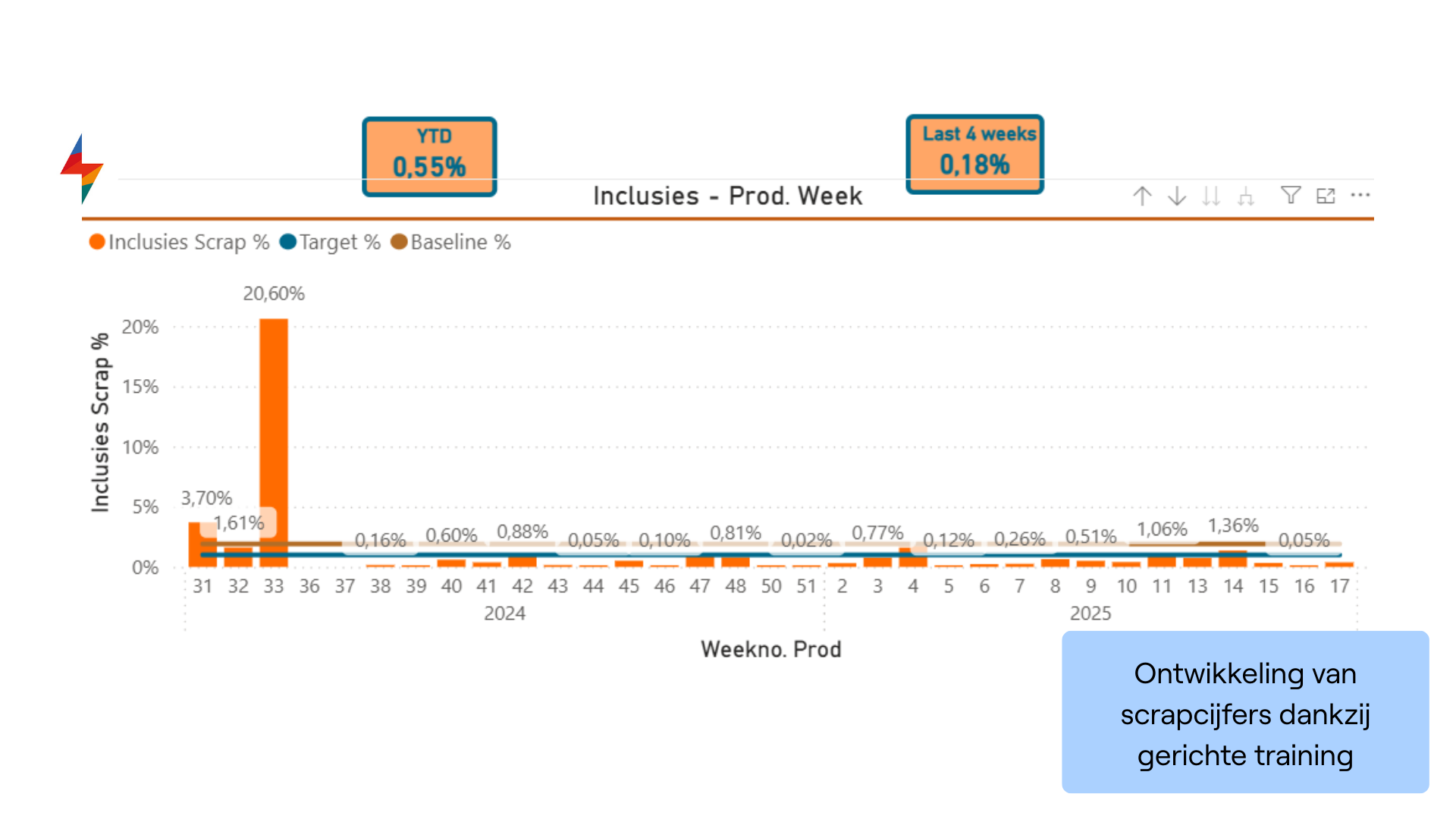 ⚡️ Het afvalpercentage (defect, beschadigd of onbruikbaar materiaal dat wordt weggegooid) lag hoog door foutieve machine-reiniging, wat de kosten opdreef.